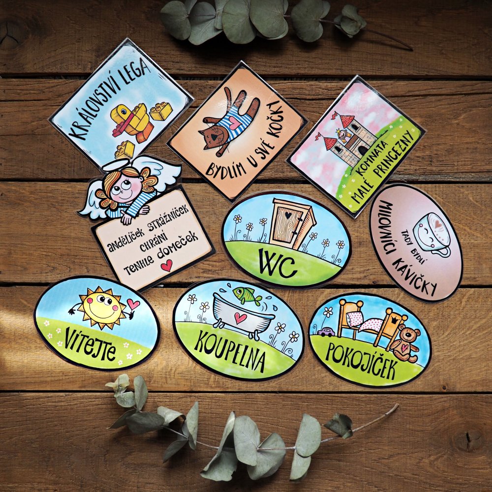 - Informační tabulky - „Zvoňte“, „Nevstupovat“, nebo vtipné vzkazy pro návštěvy.